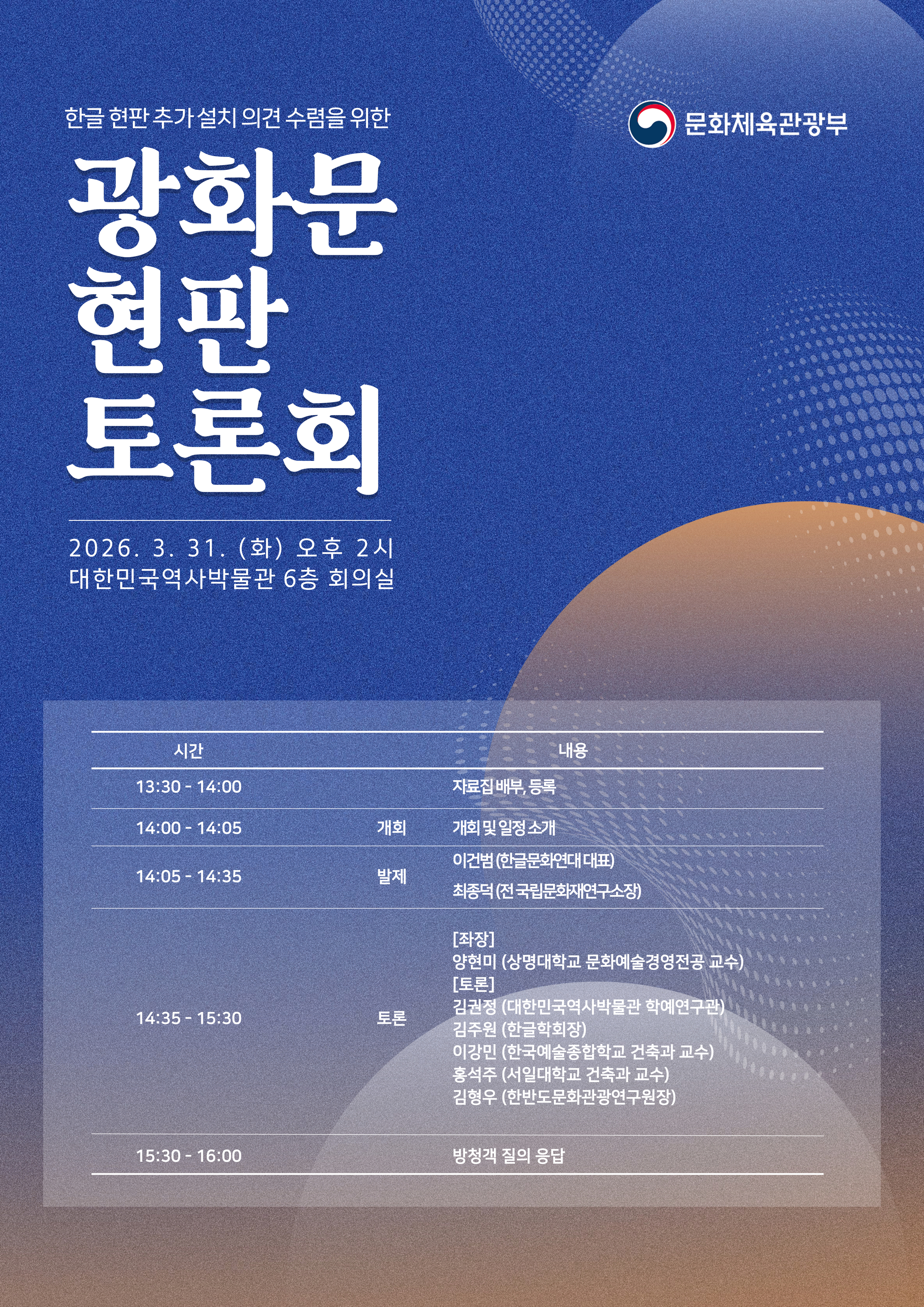 내용 : 한글 현판 추가 설치 의견 수렴을 위한 광화문 현판 토론회 개최