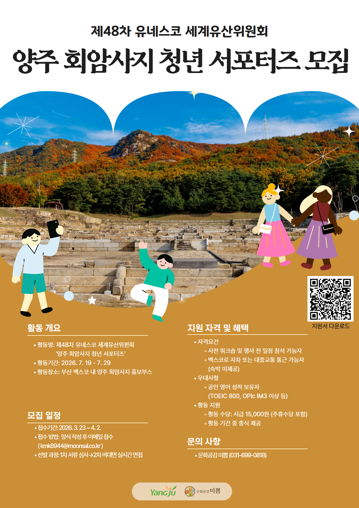 제48차 유네스코 세계유산위원회의 성공적인 개최를 지원하고 양주 회암사지의 탁월한 보편적 가치(OUV)를 전 세계에 알릴 ‘양주 회암사지 청년 서포터즈’를 모집합니다.